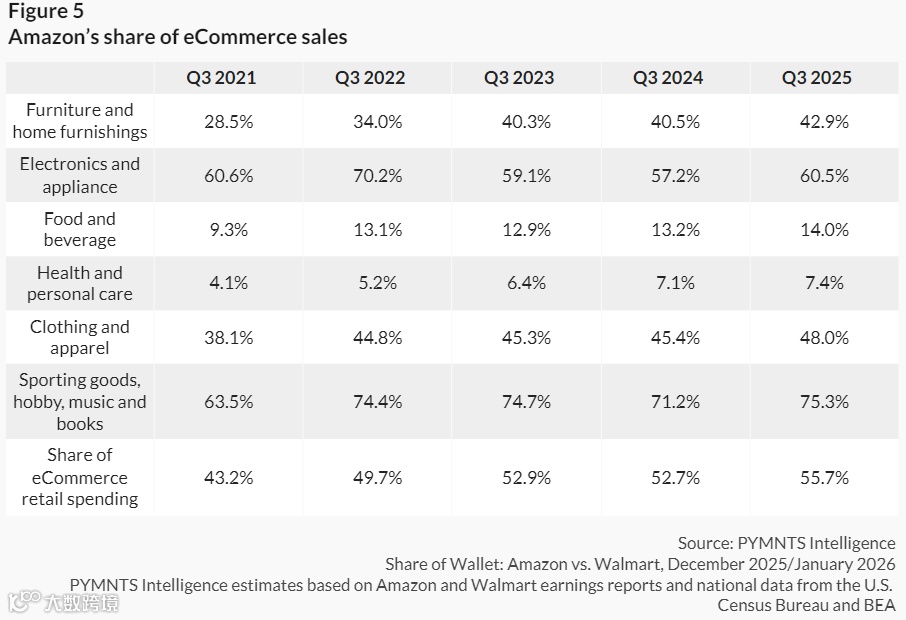 在细分品类中,亚马逊优势显著:体育用品、爱好、音乐及图书领域占电商份额75.3%,消费电子与家电达60.5%;但在食品饮料领域仅占14%,为对手留出关键增长空间。