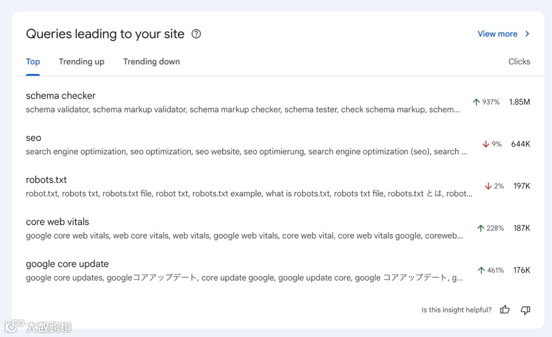 Search Console引入AI驱动“查询组”功能:将数千长尾关键词按“用户意图集群”自动归类。SEO人员可从宏观意图类别(如“研究意图”vs“交易意图”)出发评估表现,告别单关键词波动焦虑。这标志着SEO正式进入“意图管理”时代。