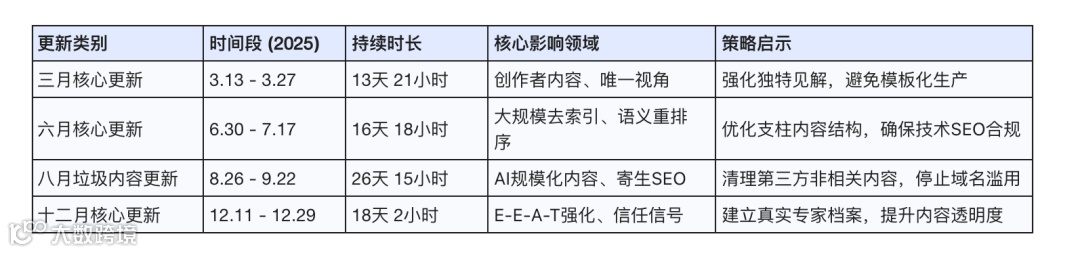2025年算法发布频次放缓,但单次更新影响空前。全年确认三次广泛核心更新(Broad Core Updates)与一次垃圾内容更新(Spam Update),协同构建高质量语料库,为生成式检索系统夯实基础。