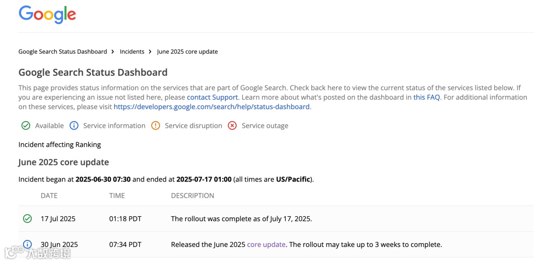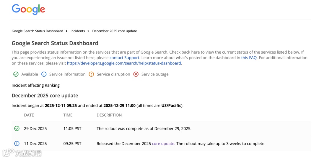 10月数据中心事故:10月3日至6日,因数据中心故障致局部服务中断,影响部分地区页面显示。Google建议此期间避免激进站点变更,因流量波动纯属基础设施问题。