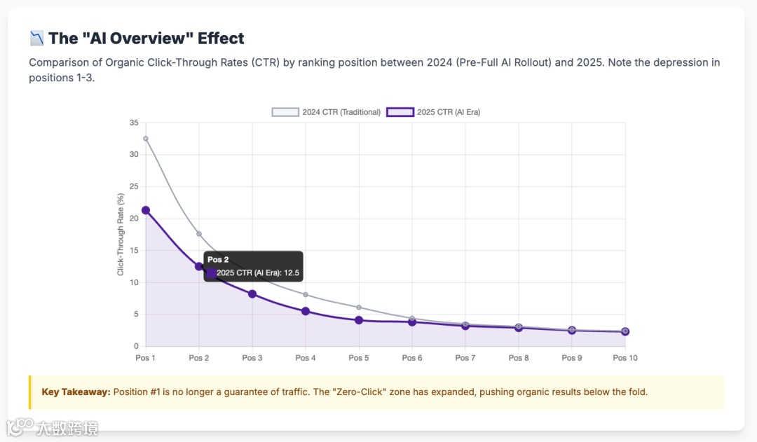 但存在“引用红利”:被AIO直接引用并列出链接的品牌,其有机点击量比未被引用但位列前10的品牌高出35%;且该流量转化率更高、用户意图更强。SEO重心需从“争第1名”转向“争AI引用位”。