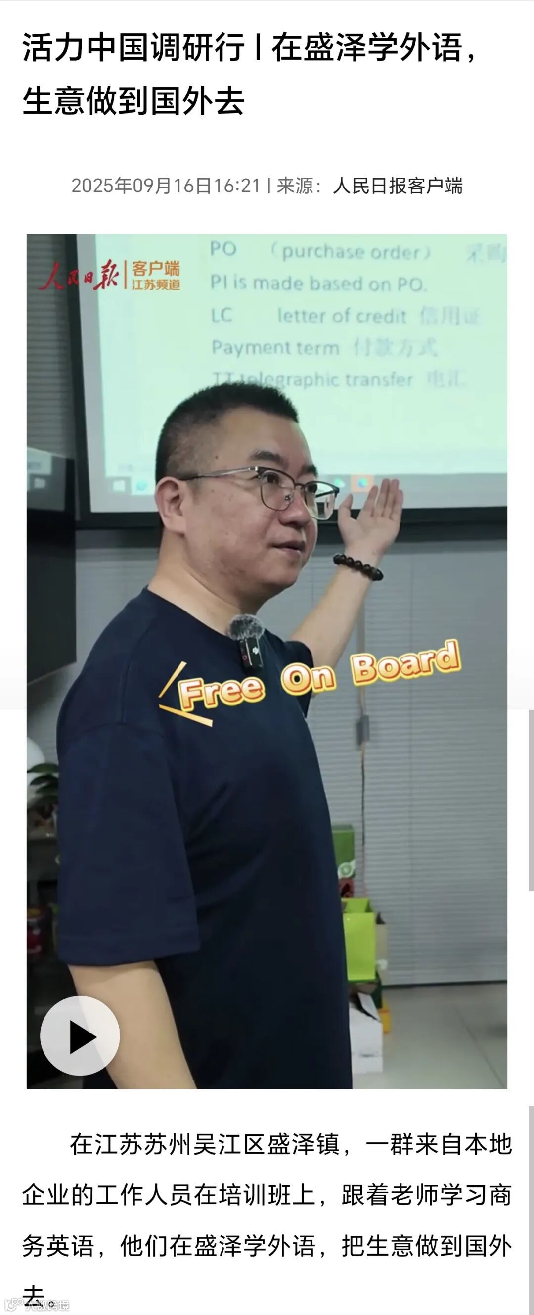 《人民日报》客户端以《在盛泽学外语,生意做到国外去》为题,报道当地企业员工积极参与商务英语培训,提升国际化沟通能力,成功将产品销往海外市场。