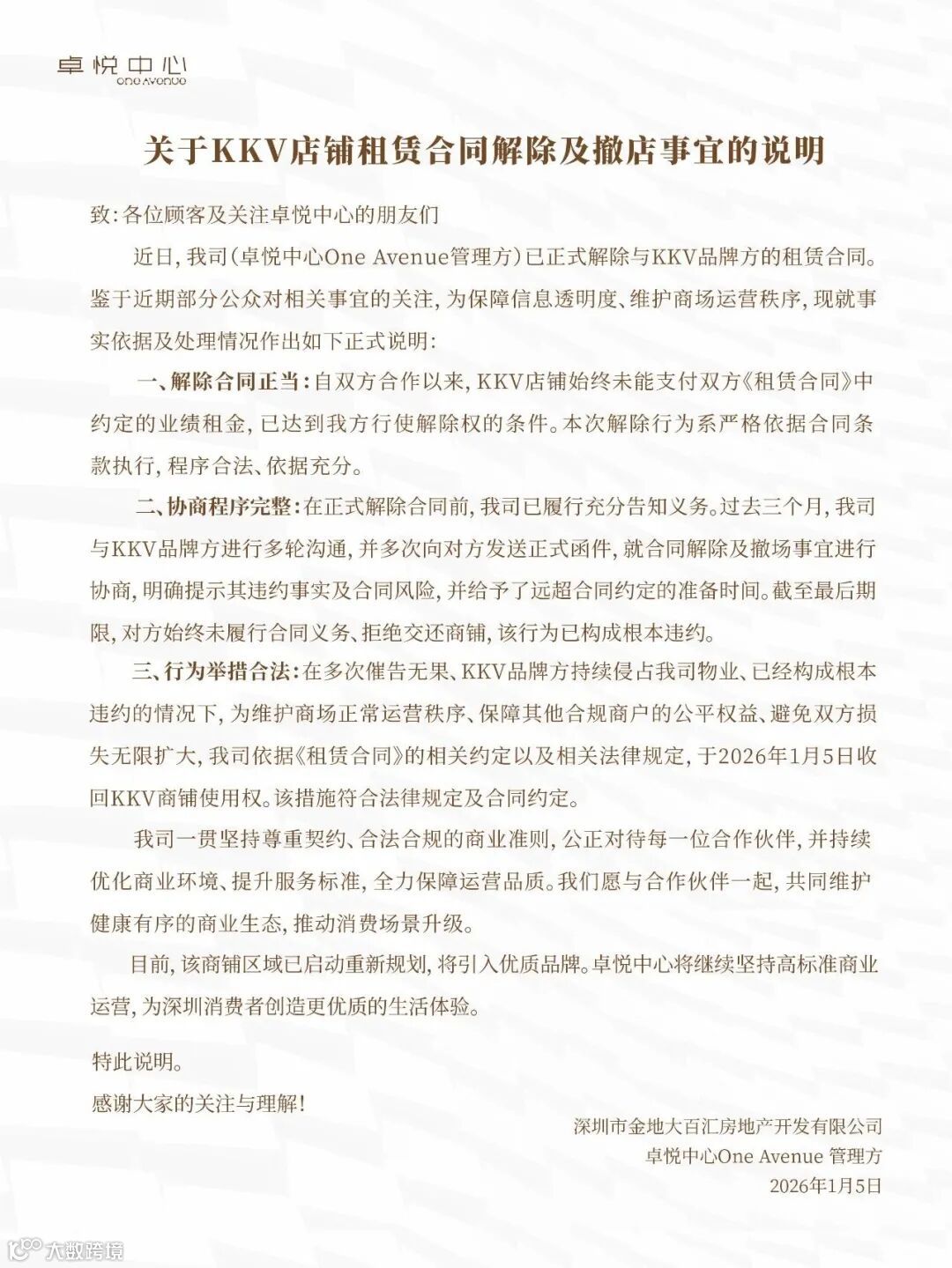 此次关停仅持续数日,门店于12月19日恢复营业。然而,2026年1月5日,卓悦中心再次采取行动,正式宣布解除与KKV的租赁合同,并收回商铺使用权。