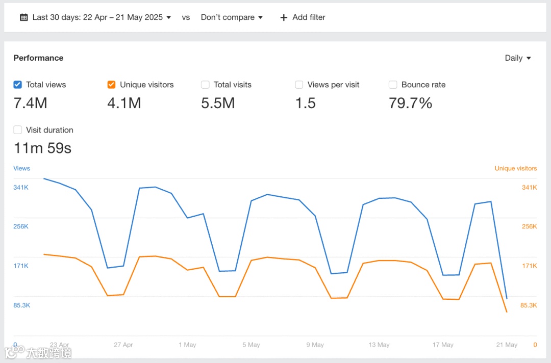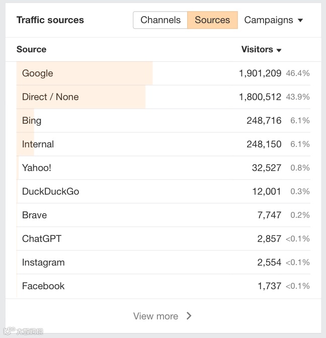借助 Ahrefs Web Analytics 可追踪各平台表现,识别真实流量来源、高访问页面及跨渠道影响力。