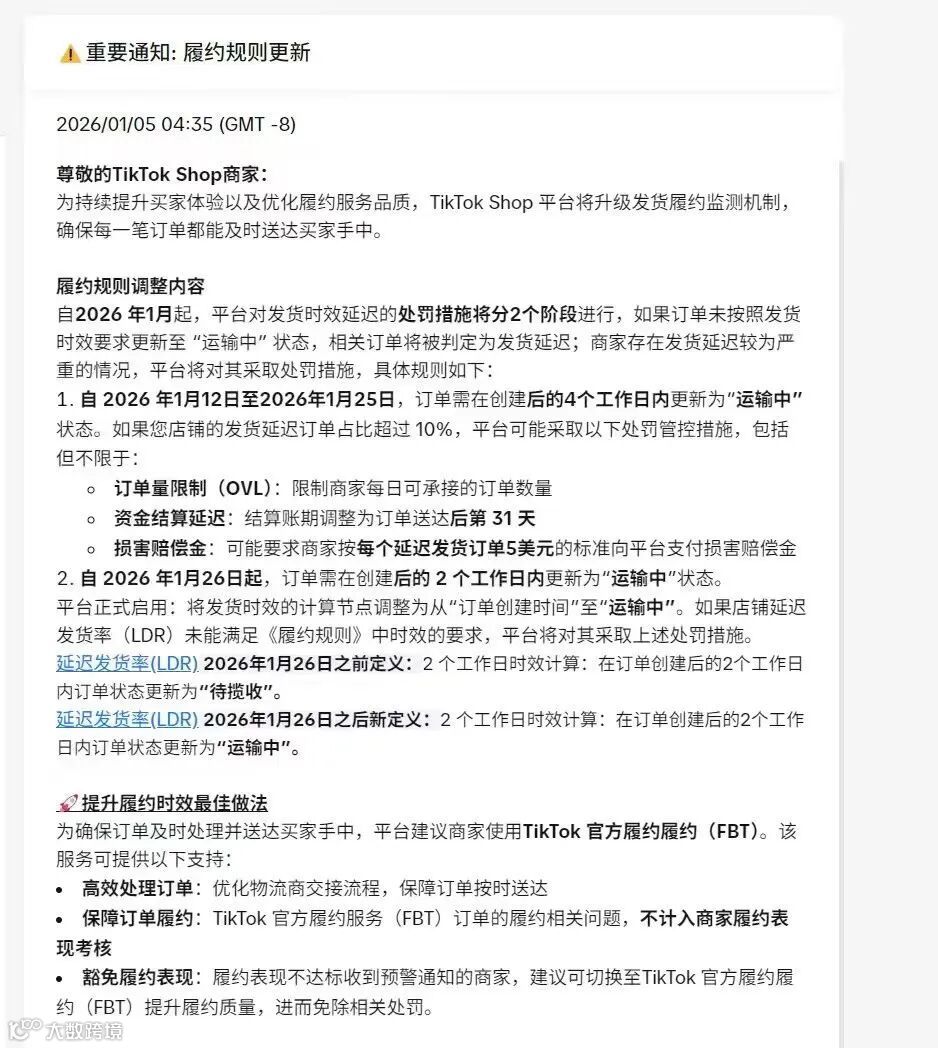 2026年1月5日,TikTok官方宣布:自2026年1月起,订单须按平台规定时限更新为“运输中”状态,否则将被判定为发货延迟。
