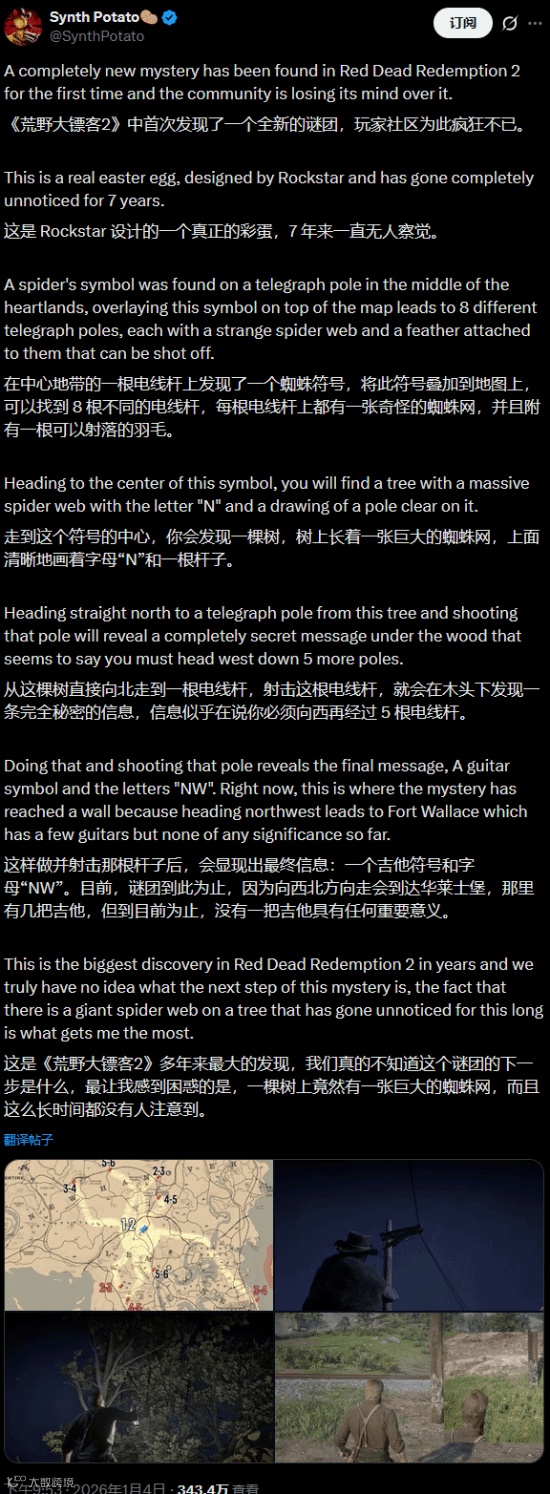 据介绍,他在游戏中心地带的一根电报杆上发现了一个蜘蛛符号。当玩家将这个符号叠加到游戏地图上时,会对应到8根不同的电报杆——每一根电报杆上都有一张奇怪的蜘蛛网,并且都挂着一根羽毛,这些羽毛都可以被射下来。