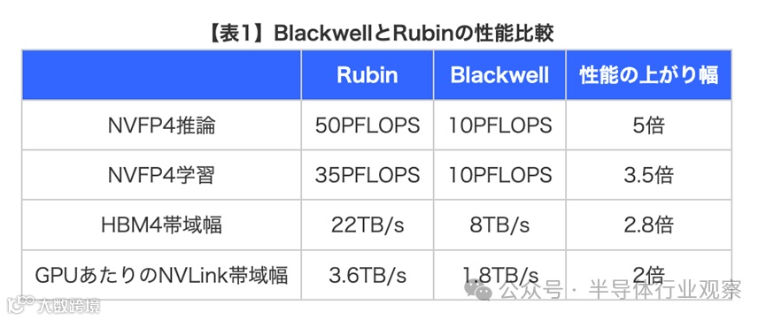 Rubin是当前一代GPU“Blackwell”(NVIDIA B300/B200/B100)的继任者,采用了全新的GPU架构和HBM4显存。根据NVFP4的计算,Blackwell的AI推理和训练性能为10 PFLOPS,而Rubin的推理性能达到50 PFLOPS,速度提升了5倍;训练性能达到35 PFLOPS,速度提升了3.5倍。