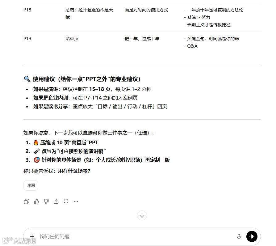 别光顾着收藏不看,哪怕现在就去试着生成两页 PPT,你就已经跑赢绝大多数人了。