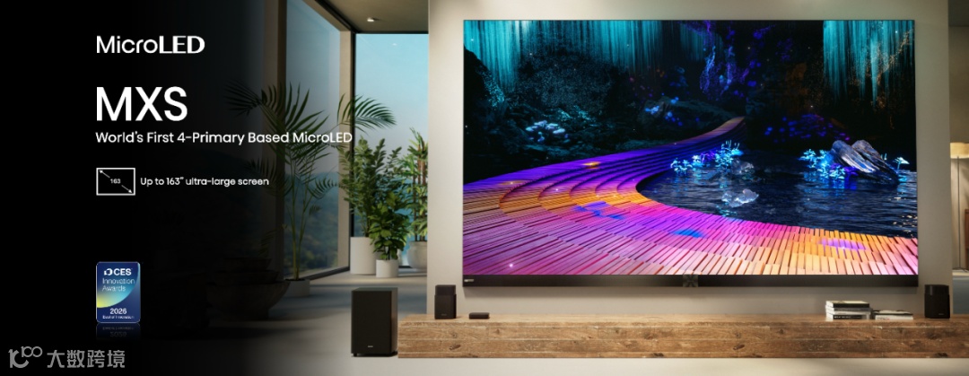 在引领未来的Micro LED领域,海信突破传统RGB三色限制,推出了全球首款四基色Micro LED——海信MX系列,斩获CES2026最佳创新奖。海信MX系列创新的独立四色像素发光架构,实现了100% BT.2020超广色域覆盖,带来更丰富、更真实的色彩呈现,颜色峰值亮度提升一倍,画面明暗过渡更细腻,细节还原更精准,带来更真实的视觉体验。