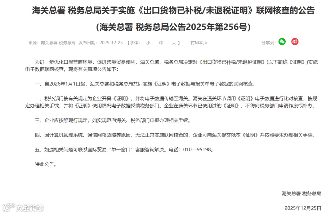 这背后,是2026年1月1日起生效的一项根本性变革:海关总署、税务总局2025年第256号公告的实施,通过出口退税数据的联网核查,正在将每一件进出口货物都置于一个透明的“数字身份证”系统之下。