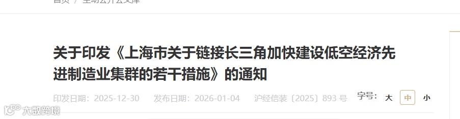 2026年1月4日,上海市经信委联合虹桥国际中央商务区及浦东新区、长宁区、闵行区、金山区政府,正式印发《上海市关于链接长三角加快建设低空经济先进制造业集群的若干措施》(沪经信装〔2025〕893号)。