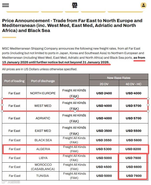 MSC地中海航运公司宣布,自2026年1月15日起,所有从远东港口(含日本、韩国及东南亚主要港口)发往北欧、地中海地区(西地中海、东地中海、亚得里亚海)、北非(阿尔及利亚、利比亚、摩洛哥、突尼斯)及黑海港口的集装箱货物,将执行新一轮FAK运价。本次调价在1月1日基础上再上涨100–300美元/TEU,部分航线40尺柜运价已达8200美元。