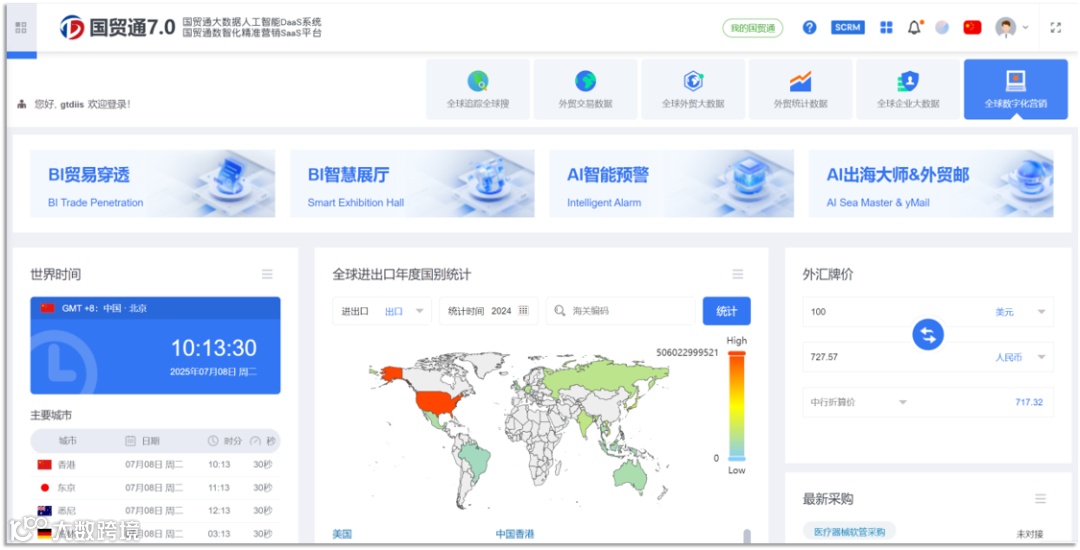作为国家高新技术企业,国贸通以技术创新为核心驱动力,自主研发外贸大数据商务智能DaaS系统7.0,深度融合大数据、人工智能与商业智能技术,将分散在全球的贸易信息转化为可分析、可判断、可行动的商业洞察。该系统相当于一位全天候运转的“全球商业智能助手”,助力企业快速识别市场机会、精准锁定客户、洞察供应链变化、实时监测竞争态势。