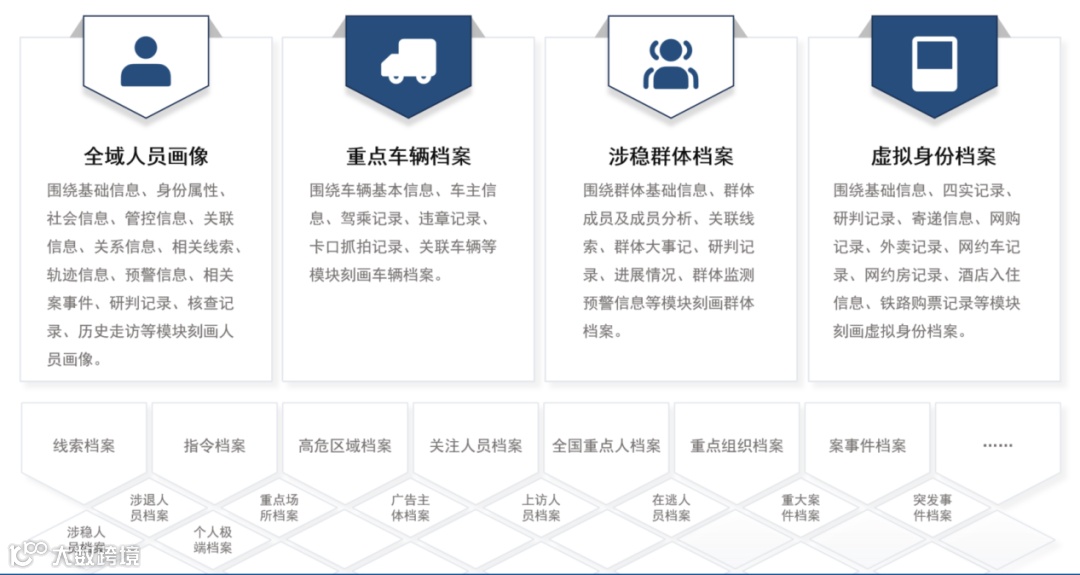 - 专项档案:延伸至涉稳群体、虚拟身份、重点场所、重大案件、高危区域等,满足情指、刑侦、治安、经侦等多警种业务需要,真正实现“一档在手,全域可知”。
