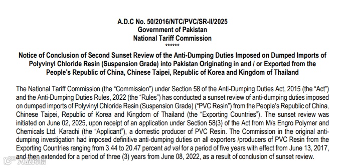 2026年1月2日,巴基斯坦国家关税委员会发布公告,决定继续对原产于或出口自中国大陆、韩国、泰国和中国台湾省的悬浮级聚氯乙烯树脂(PVC)征收反倾销税,措施有效期为三年。