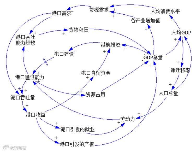 - 港口–经济阻碍反馈(负反馈):资源消耗加剧,在特定阶段可能抑制GDP增速。