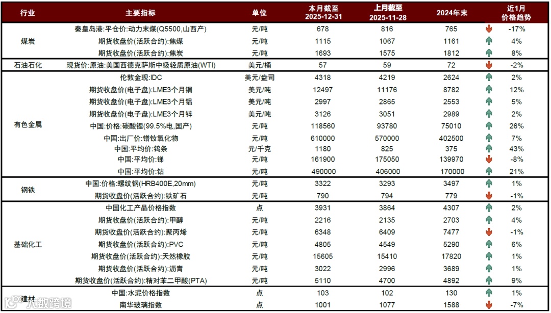 供需错配叠加货币宽松,价格全面走强。12月伦敦金+2%;LME铜、铝、锌期货价环比+12%、+5%、+2%(同比+42%、+17%、+5%);国产碳酸锂(99.5%电)+26%(同比+58%);稀土、钨条、钴价环比+7%、+43%、+21%(同比+52%、+215%、+188%)。AI与能源革命带动高端制造及电力需求增长,叠加供应刚性,支撑价格中枢上移。