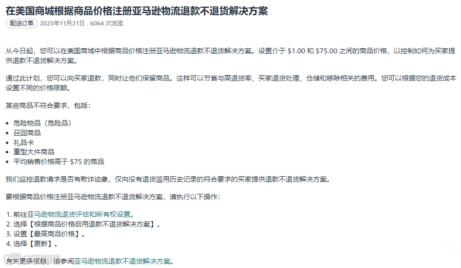 11月下旬,亚马逊推出了一项面向FBA卖家的“仅退款”计划。卖家可自行设置1至75美元的商品价格区间,在此范围内的订单若买家申请退货,系统可能自动提供“无需退货即全额退款”的选项。