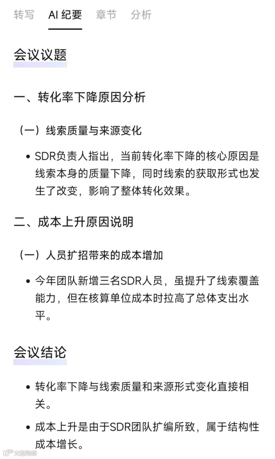 比如,对于SDR指标数据的分析,来自SDR Leader对“转化率”和“成本”异常指标的解释和陈述。