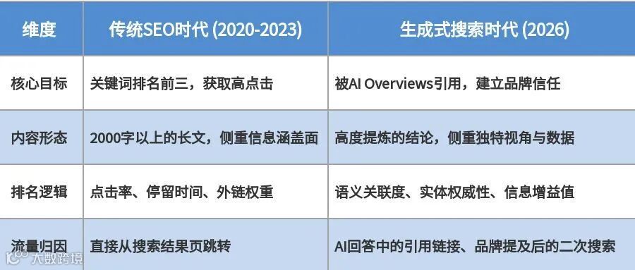 2026年,生成式搜索引擎优化(GEO)成为核心,取代了传统SEO模式。GEO不再只看重页面在谷歌爬虫中的评分,而是聚焦于内容能否被大语言模型(LLM)识别,并作为权威信息嵌入AI回答。
