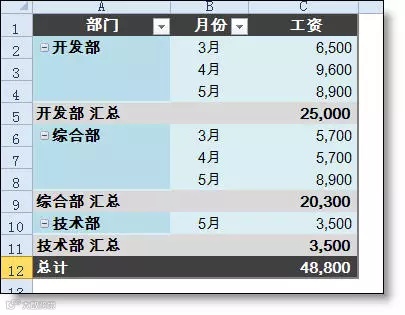 如下图所示工资表中,含有多个月份的数据。要求在汇总表中把所有月份的数据汇总到一起。
