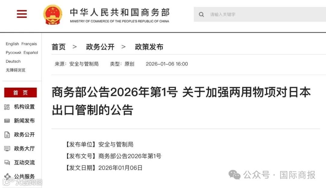 1月6日,商务部发布2026年第1号公告,关于加强两用物项对日本出口管制。