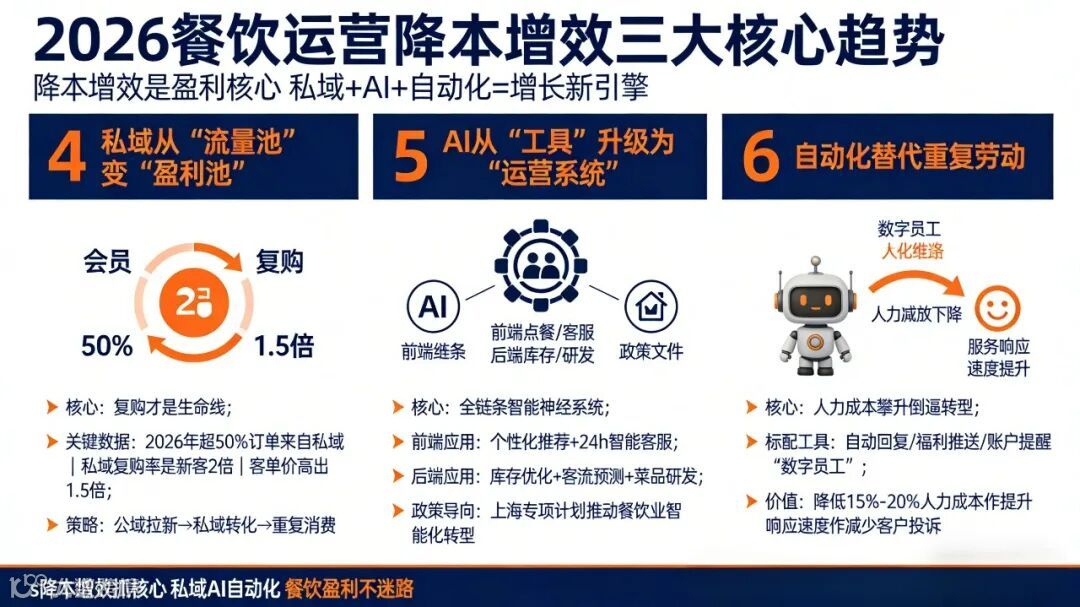 AI不再是噱头,而是餐饮降本增效的核心引擎。2026年,AI将从单点应用(如AI点餐)升级为贯穿全链条的“神经系统”:前端可实现个性化菜品推荐、24小时智能客服;后端能通过大数据优化库存管理、精准预测客流,甚至辅助菜品研发。上海已出台专项计划,推动AI技术助力餐饮业标准化、智能化转型,政策导向十分明确。