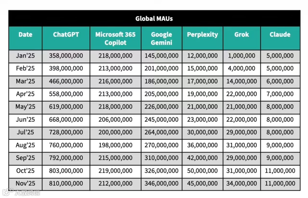 Sensor Tower数据显示,截至2025年11月,Gemini全球月活跃用户(MAU)同比增长170%,虽略低于ChatGPT的180%,但增速势头强劲。