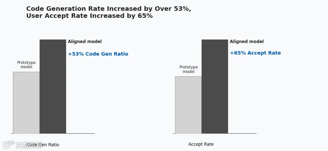 经 ActionRL 对齐优化后,模型代码生成占比提升超 53%,执行一致性显著增强,能遵循“启动重构即完成全套动作”的内在逻辑,大幅减少原型模型在中间步骤中断或不完整执行的问题。代码采纳率提升 65%,推理细节准确率亦持续上升,验证其在复杂编辑任务中的可靠性与实用性。
