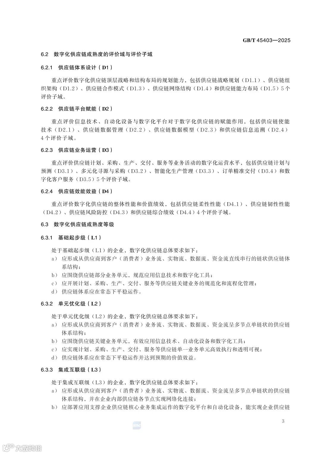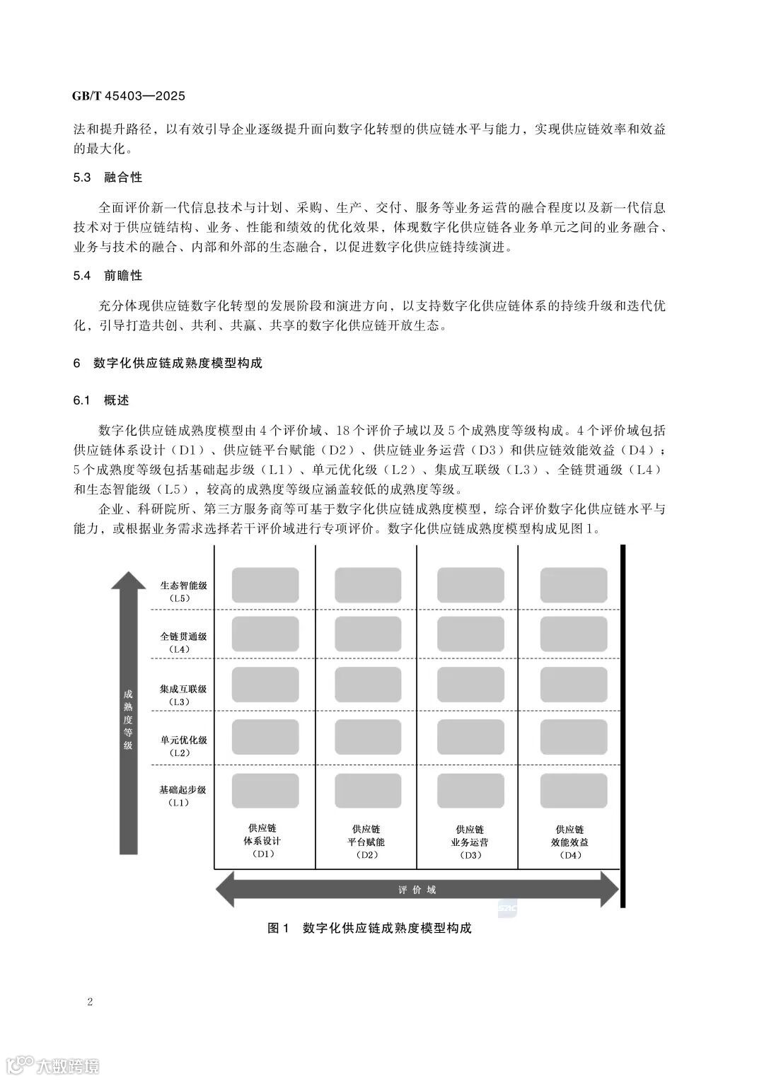 《数字化供应链 成熟度模型》(GB/T 45403—2025)已于2025年正式实施。该标准遵循科学性、实效性、融合性与前瞻性原则,构建了覆盖4大评价域(供应链体系设计、平台赋能、业务运营、效能效益)、18个评价子域及5个成熟度等级(基础起步级、流程规范级、集成协同级、智能优化级、生态智能级)的完整评估体系。