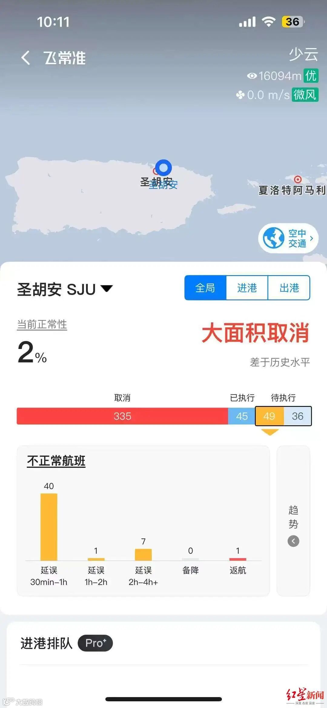 捷蓝航空当日宣布取消约215个航班;波多黎各圣胡安机场航班正常率仅2%。