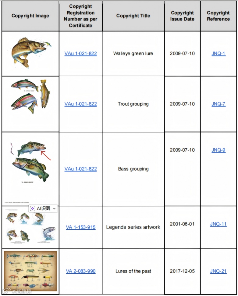 JQ Licensing, LLC系艺术家Jon Q. Wright创立的艺术授权公司,专注鱼类、野生动物及自然主题原创插画授权。其作品已登载于56+行业目录及杂志封面,淡水鱼系列限量版画广受收藏市场青睐。2025年12月16日,权利人就其注册商标及美术作品版权发起维权(案号:25-cv-07213),指控Temu平台上588家店铺擅自使用其“Fish Illustration”系列插画及关联标识,构成版权与商标双重侵权。