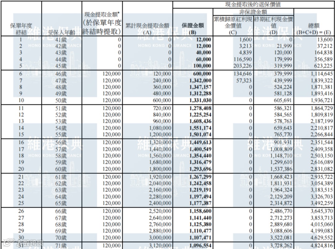 主打“边领钱、边增值”特性。同样按40岁女性、年缴40万元、缴费5年测算:自第6年起每年领取12万元,仍可维持账户持续增长。