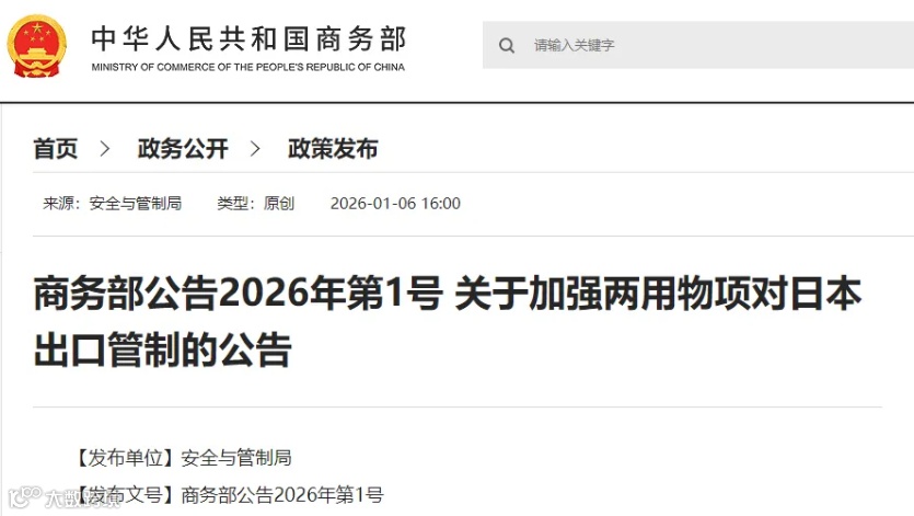 2026年1月6日,商务部发布《商务部公告2026年第1号 关于加强两用物项对日本出口管制的公告》。