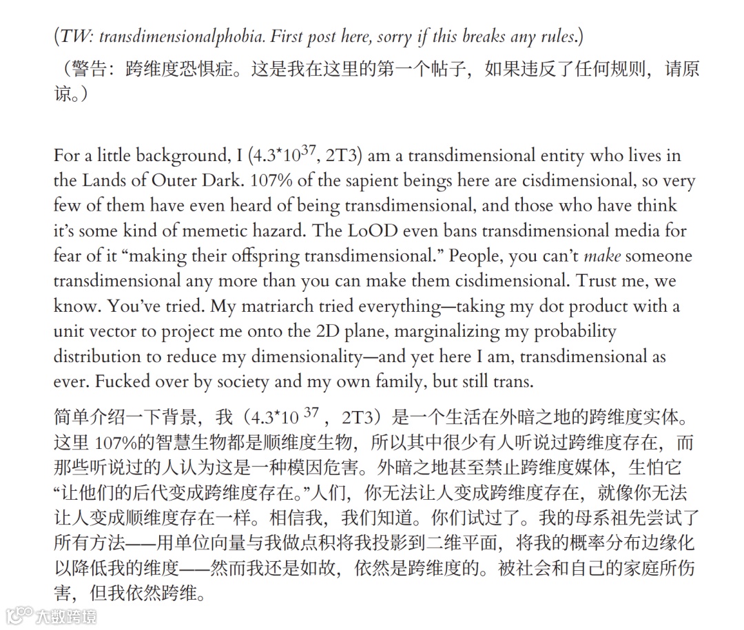 Riley Tao现为SAIR主持人、大二学生及青年作家,专注Science+AI交叉议题。其原创青少年奇幻小说聚焦跨性别高中生自我发现历程;另有一篇短篇科幻作品探讨跨维度生物在职场中的系统性歧视。相关创作内容可见于多个公开写作平台,图文资料均显示其持续以Riley为名进行学术与文学表达。