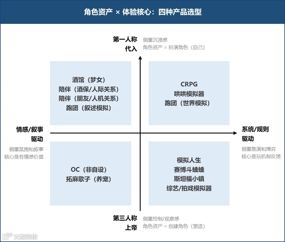 一方面,用户是第一人称的「代入」,还是第三人称的「上帝」,即可被积累和跨越体验的角色资产是否为用户本人;