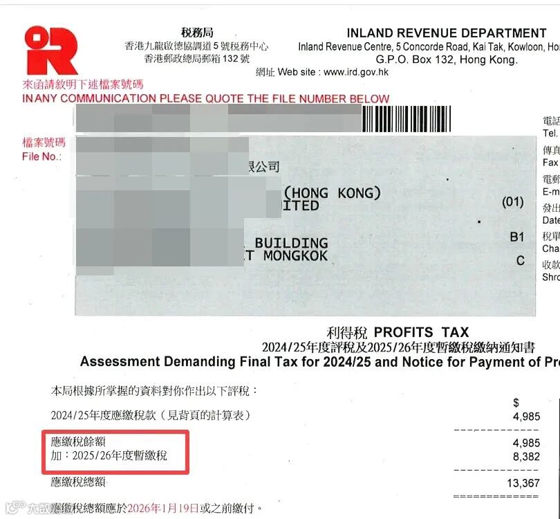 在香港公司运营过程中,若企业产生盈利并完成利得税申报程序后,纳税人将收到税务局发出的评税通知书。这份文件通常会列明两项重要金额: