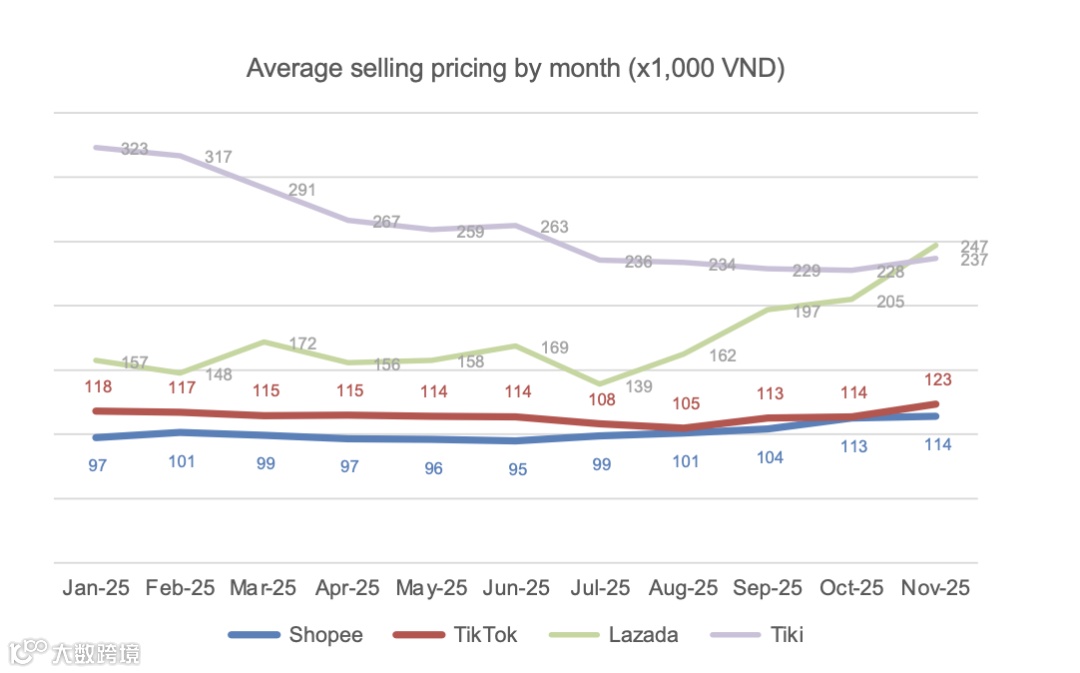 在定价策略方面,Shopee 和 TikTok Shop 都将自身定位为平价购物平台,其平均售价 (ASP) 远低于竞争对手。具体而言,Shopee 的平均售价在 97,000 越南盾至 114,000 越南盾之间,而 TikTok Shop 的平均售价则在 118,000 越南盾至 123,000 越南盾之间。Shopee 的价格范围更广,涵盖了平价和高端商品,而 TikTok Shop则主要专注于低价商品,以刺激冲动消费。