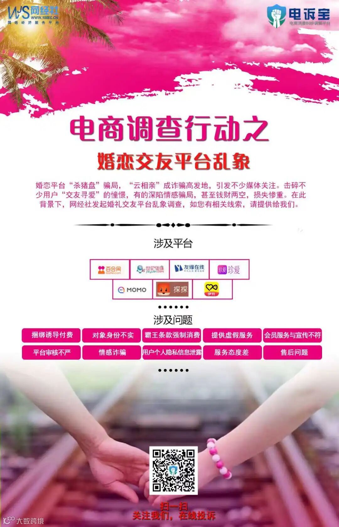 2018年至今,根据国内知名网络消费纠纷调解平台“电诉宝”(315.100EC.CN)受理的婚恋交友领域用户有效投诉显示(依据投诉量排行),珍爱网排名第5位。