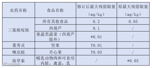 本次修正重点制修订三氟吡啶胺等多种农药在各类食品中的最大残留限量。表格中标注“T”表示暂定限量,“*”代表限量设定在或接近检测限。