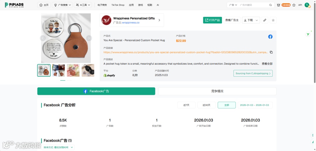 本期聚焦美国市场现象级单品:“You Are Special - Personalized Custom Pocket Hug”可定制雕刻纪念币。一枚随身携带的圆形不锈钢纪念币,通过深度家庭情感定制(如亲子、祖孙、情侣姓名+寄语),在年末节日季实现单日110万次广告播放,精准激活亲情消费场景。其背后的情感营销策略值得跨境卖家重点关注。