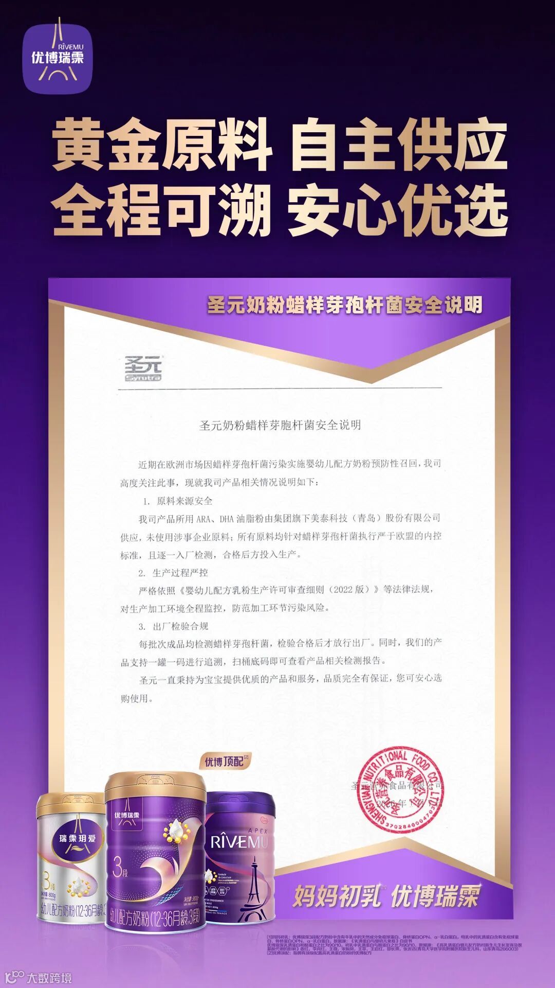 产品所用ARA油脂粉由圣元国际旗下美泰科技(青岛)股份有限公司供应,原料入厂前逐批检测合格后方可投产;每批次成品均检测蜡样芽孢杆菌,检验合格后方予放行。