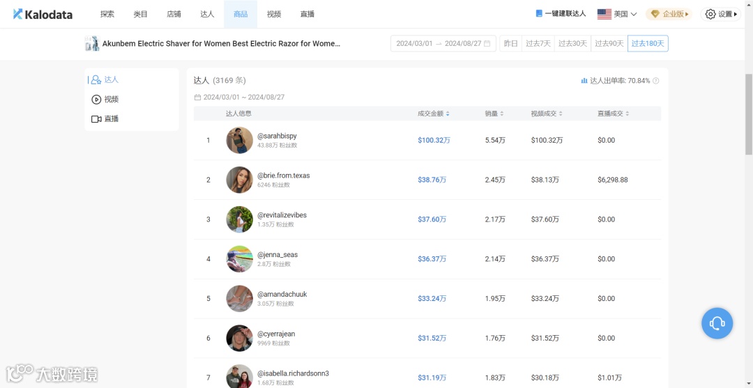 共有3169位达人参与了这款剃须刀的推广,达人出单率高达70.84%,意味着每10位参与推广的达人中有超过7位成功促成了实际销售。这一高转化率不仅凸显了达人的营销能力,也反映了产品本身的吸引力和市场需求的强劲。