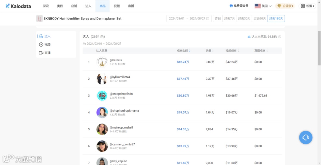 在SKNBODY的成功背后,达人营销再次发挥了至关重要的作用。过去半年建联了2654个达人,达人出单率为64.88%。