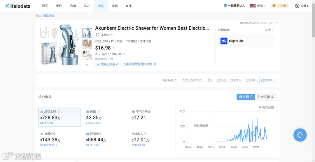 炎热的夏天即将结束,据Kalodata数据,一款女士剃须刀在这个夏天表现极为出色,自上架以来销量持续攀升。过去半年该产品在TikTok销量已突破42万台,累计销售额高达728.83万美元。
