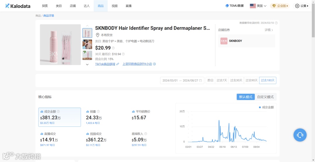 在TikTok美区,除了Akunbem女士电动剃须刀的热销外,另一款专为女性面部设计的剃须产品也表现不俗。SKNBODY品牌凭借其创新的女性面部剃须刀和毛发识别喷雾组合套装,在过去半年内成功引发了一股销售热潮,共售出24.33万套,累计成交金额达到381.23万美元。