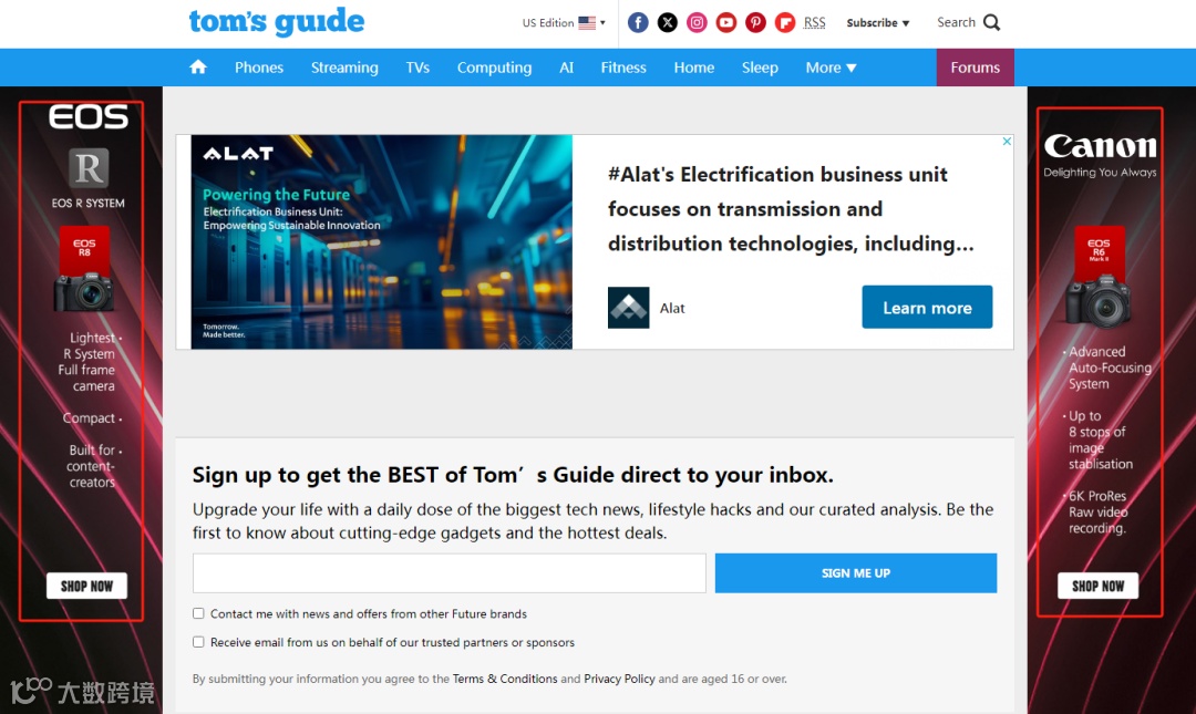 1.展示型广告:例如佳能相机在Tom's guide官网首页的横幅广告,并带上Shop Now的行动号召。