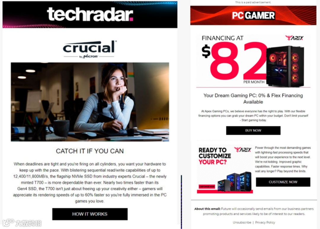 4. Newsletter赞助:定制EDM赞助方案,把品牌及产品信息巧妙地植入订阅内容,触达数十万的邮件订阅用户。(备注:Techradar/Pcgamer/Tom's guide同属Future集团,故此处案例引用Techradar&Pcgamer)