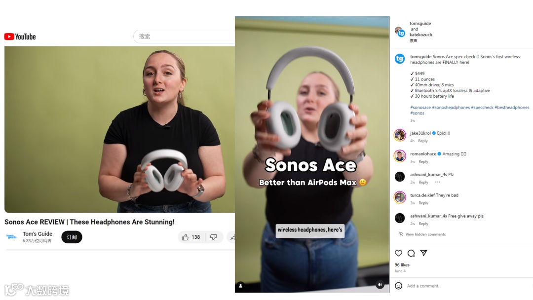 3. 社媒帖子:Youtube+Instagram reel组合:Sonos Ace头戴式耳机