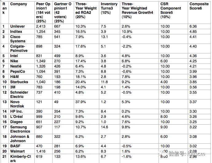 2018年5月17日,Gartner发布了2018年度的供给链25强榜单,联合利华接连第三年取得第一名,其次是Inditex,思科,高露洁和英特尔。 Home Depot在三年的停顿后重新进入了排名,而诺和诺德和阿迪达斯初次进入供给链前25名,值得的关注的是,接连5年仅有上榜的我国企业-联想,这次没有进入25强榜单。
